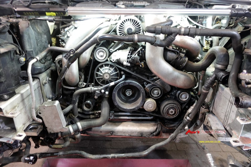 좌.우 커버 모두 실리콘작업 완료해주고 조립해줍니다. 그리고 누수의 원인인 터보차져 냉각파이프 탈거해줍니다.